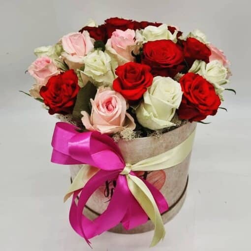 Szivárvány minden színében, a legszebb rózsákat tesszük Önnek egy csodaszép virágdobozba.